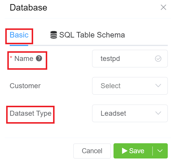 - Write the name of your database (testpd in this example) and select Leadset from the Dataset Type dropdown in the Basic Tab.
