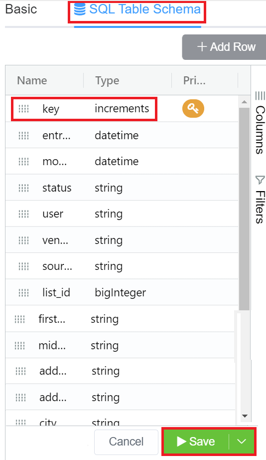 - Select the SQL Table Schema and change the Type of the Key parameter to increments, and click on Save. This will create and save your database.