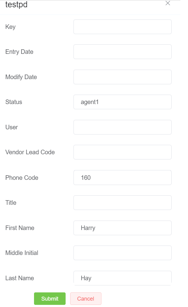 +sign, which will open a form with various entries. The form is generated by the parameters of the leadset. - In this example, we have considered three fields, First name, Last name, and Phone Code. Also, in the Status field write agent1 and save the form.