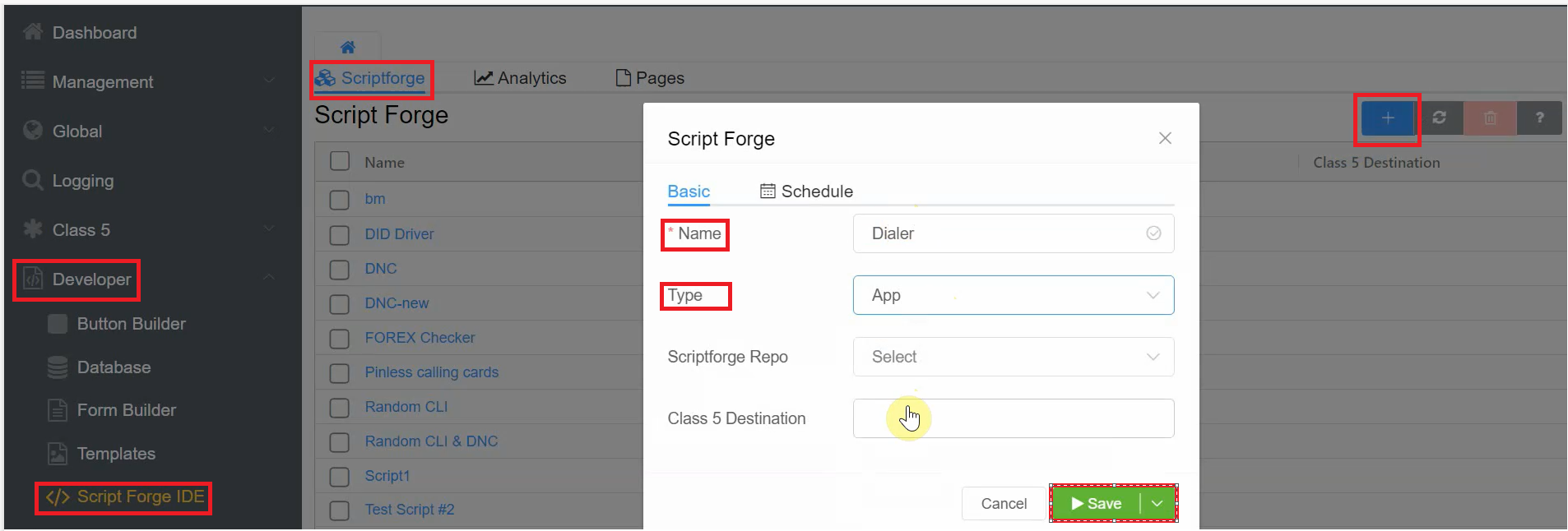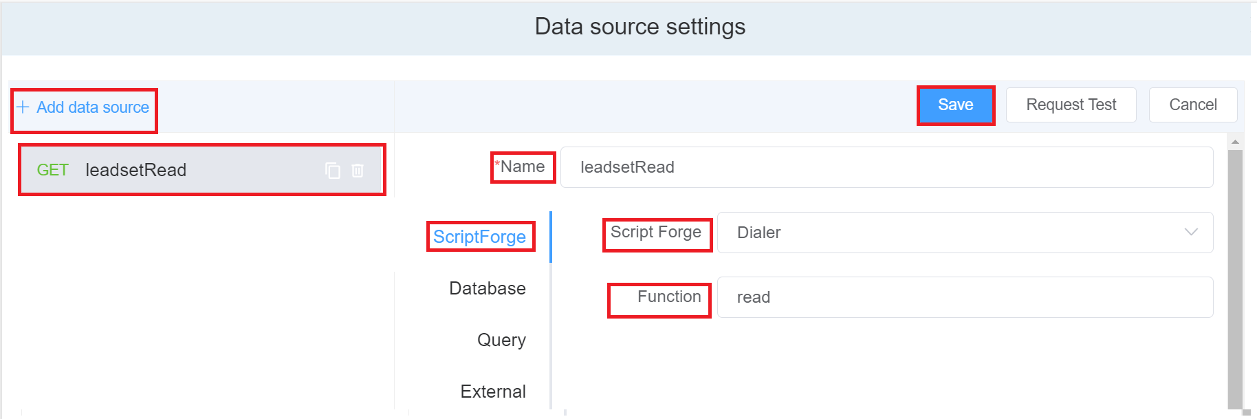 - Next, from the Script Forge dropdown select the Dialer script and name the function as read and click on the blue `Save' button.