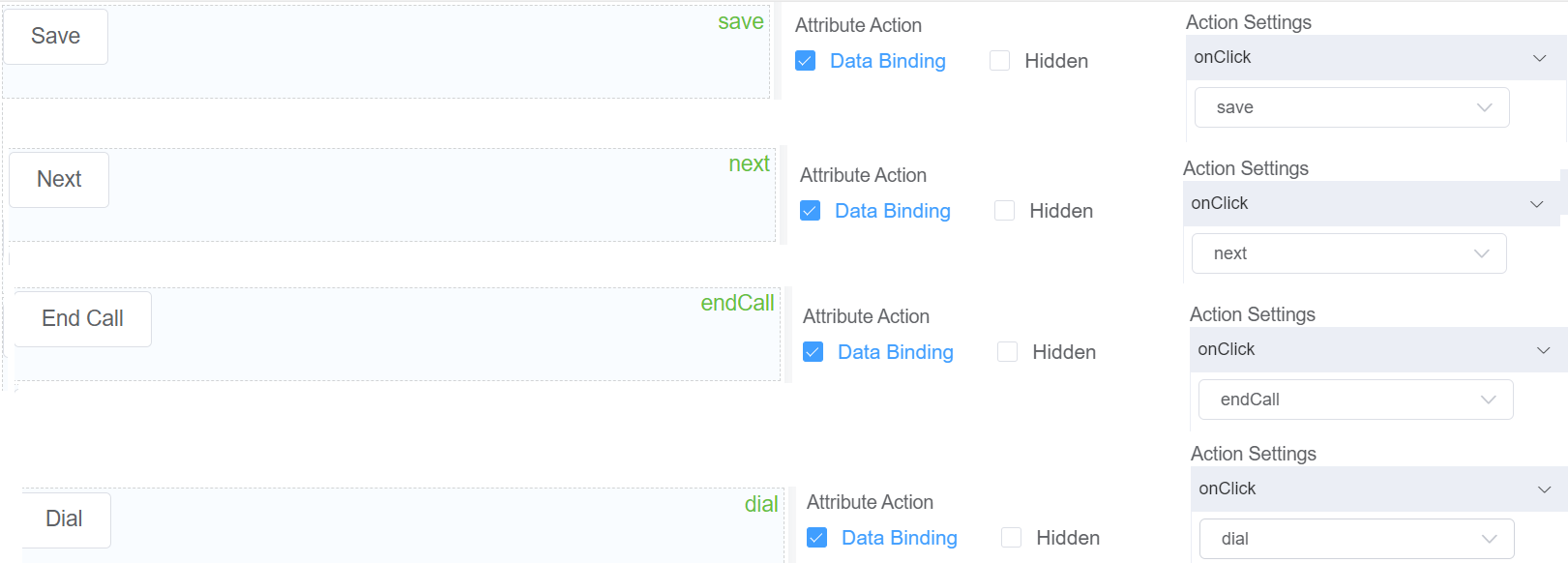 - Insert the Buttons to perform various functions like Dial, End Call, Save and Next.